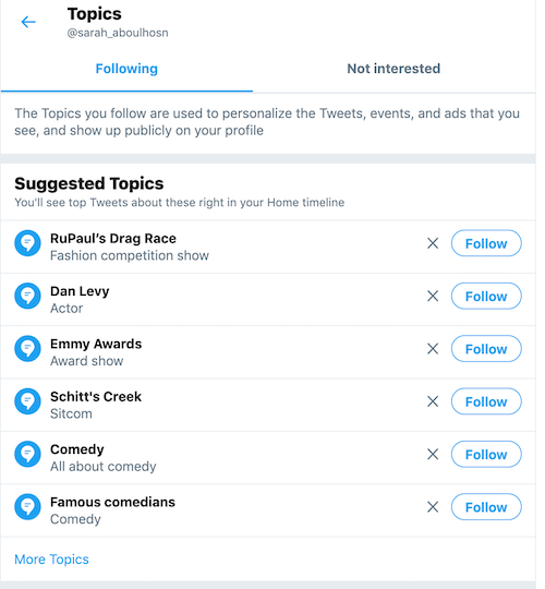 Twitterで特定の人をフォローできるのと同じように、全体的なトピックをフォローできるようになったため、特定のテーマに関するさまざまな投稿を表示できます。 これは、フォローされているアカウントのベースを有意義に拡大し、特定のトピック領域で誰が影響力を持っているかを見つけるための優れた方法です。