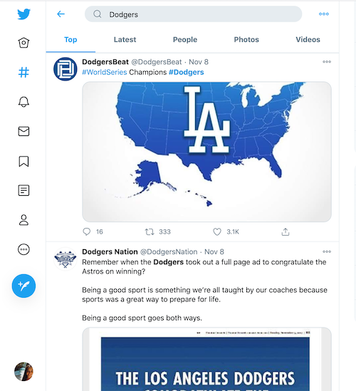 Twitterのネイティブ検索機能を使用すると、ハッシュタグ、トレンドトピック、または一般的な用語を検索できます。 この機能を使用して、ブランド名を検索して人々がそれについて話しているかどうかを確認したり、業界チャットやキャンペーンハッシュタグなどのハッシュタグを検索して、人々が何を言っているのか、どのように投稿に組み込んでいるのかを調べることができます。