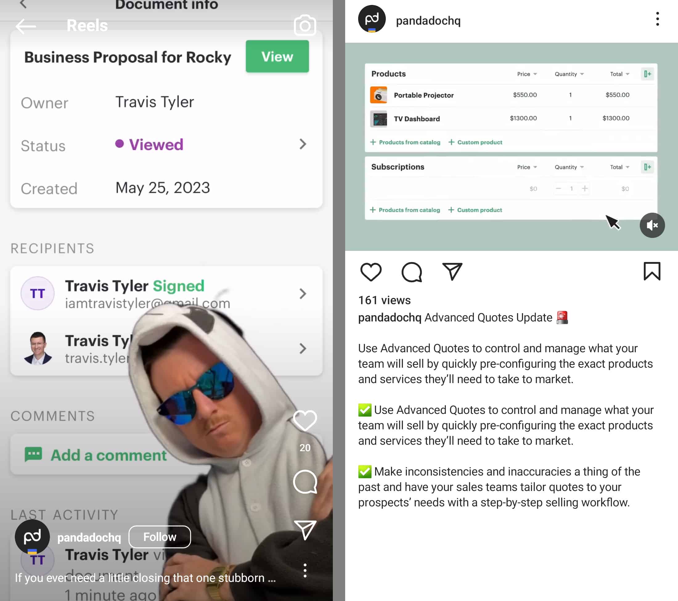 たとえば、@pandadochq は Instagram を使用して機能リリースを共有し、リールを活用して製品のウォークスルーや説明ビデオを提供しています。 同社はまた、Customer Engagement Lab ポッドキャストの抜粋や、特徴的なパンダの着ぐるみを着たシニア デジタル コンテンツ プロデューサー @iamtravistyler が登場する面白いビデオも公開しています。