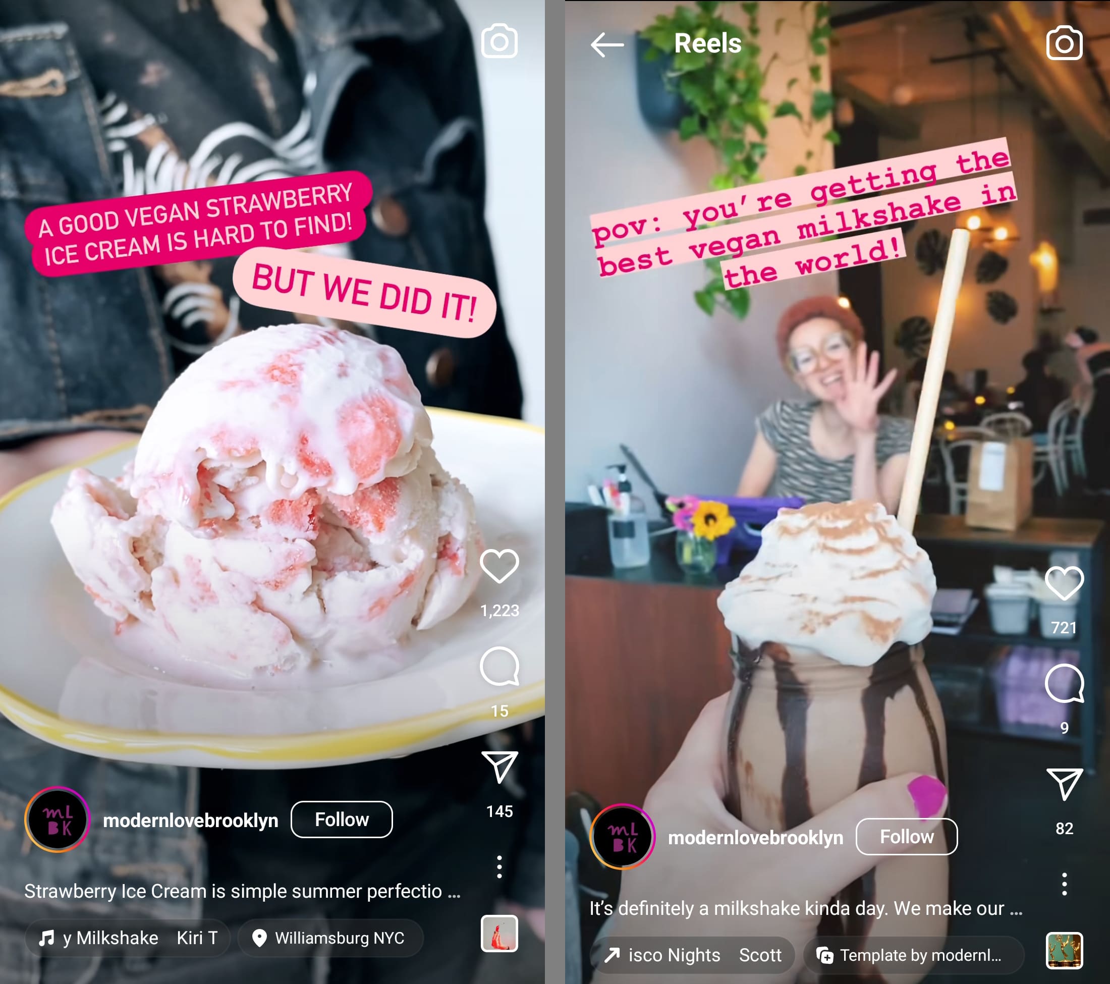 たとえば、@modernlovebrooklyn は Instagram リールで定期的に新しいメニュー項目を紹介しています。 定型的なものではなく、それぞれの短編ビデオは、レストランの創造的な盛り付け、キッチンの舞台裏、または顧客の視点から新鮮な視点を取り上げています。