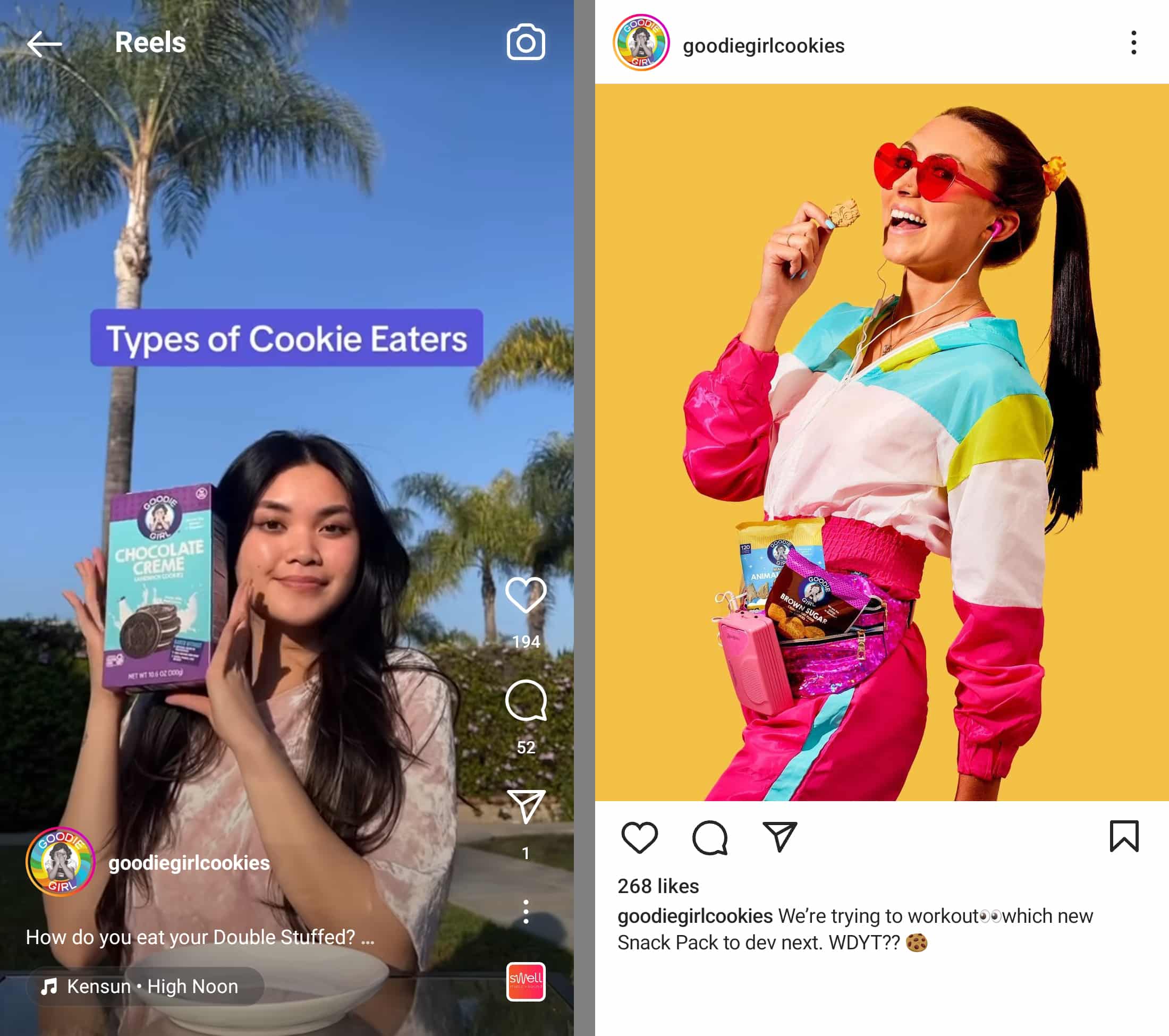 たとえば、@goodiegirlcookies のカラフルなコンテンツは必ず私の目を引き、お腹を空かせます。 クッキー会社のフィードには、顧客に新製品をリクエストしたり、共感できる人物を特定したりするよう促す魅力的な投稿がたくさんあります。 リーチを拡大するために、同社は頻繁に共同ブランドのプレゼント企画を主催したり、インフルエンサーと提携したりしています。
