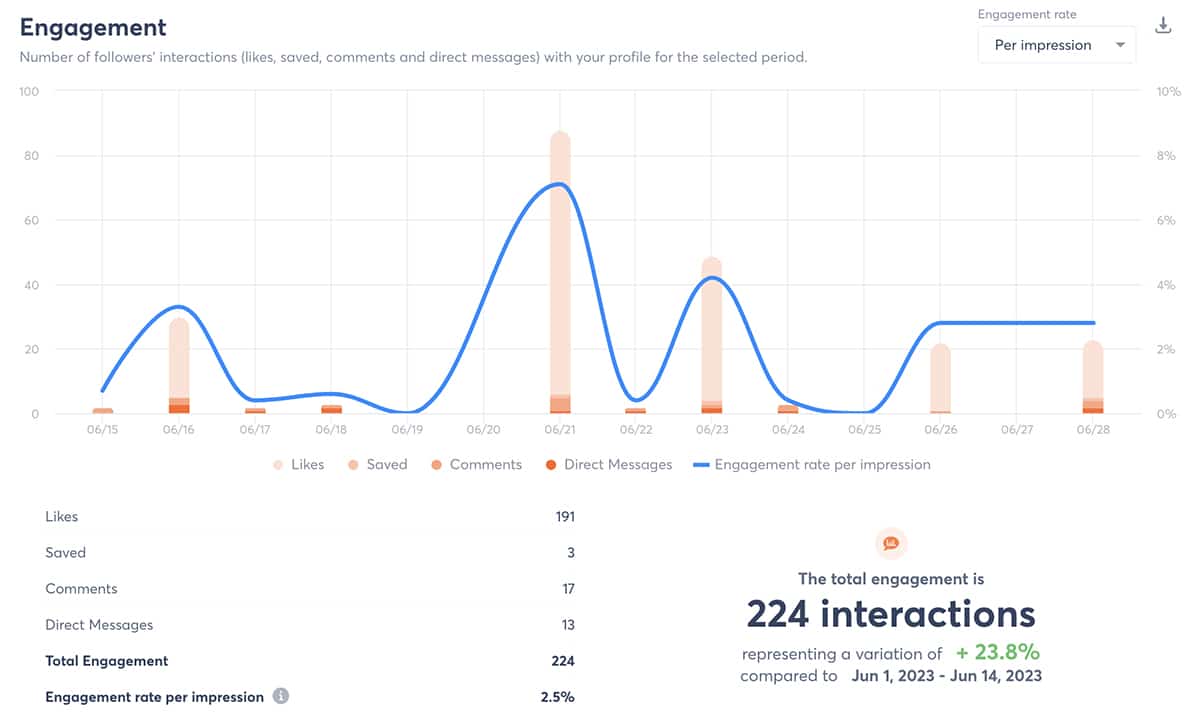 Instagram のネイティブな分析情報を使用して、アカウントの成長を監視し、コンテンツのパフォーマンスを追跡できます。 プロフェッショナル ダッシュボードから、タップしてインサイトを開き、リーチ、エンゲージメント、フォロワーの指標を参照します。