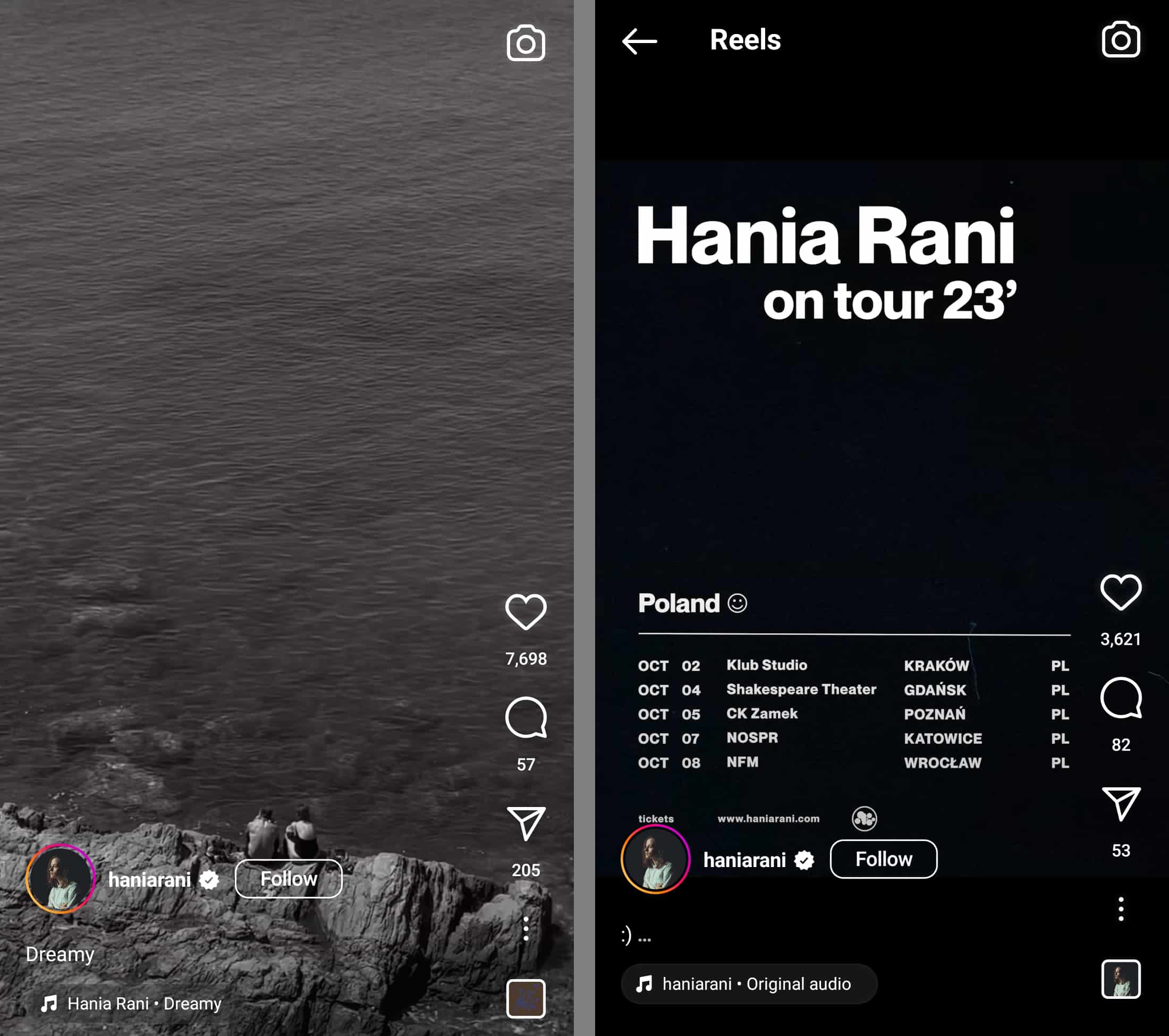 たとえば、@haniarani は Instagram を使用して、新しい音楽からクリエイティブなムードまであらゆるものを共有しています。 ピアニストはこのチャンネルを通じてツアーの日程やアルバムの詳細も発表します。