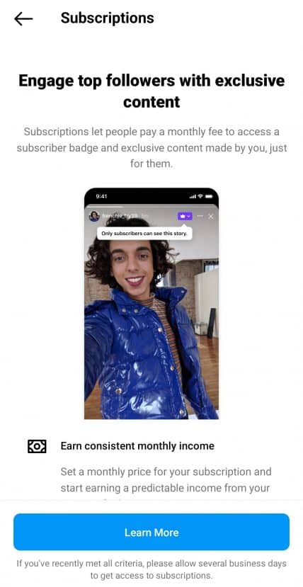 クリエイターは Instagram でサブスクリプションを開始することもでき、コミュニティ内の視聴者向けに限定コンテンツを公開できます。 サブスクリプションには、ライブ、投稿、ストーリー、ブロードキャスト チャンネルなど、幅広いコンテンツを含めることができます。