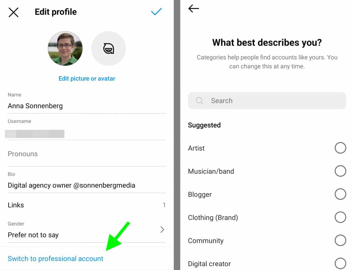 アカウントの種類の切り替えは簡単です。 Instagram の個人アカウントを開き、[プロフィールを編集] ボタンをタップし、画面の下部にある [プロアカウントに切り替える] ボタンをタップします。 次に、カテゴリとアカウントの種類を選択します。