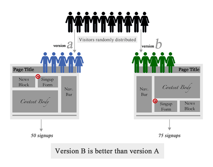 A / Bテストは、ページの1つのバージョンが他のバージョンよりも効果的かどうかをテストする方法です。 このテストは、同じページの2つの異なるバージョンが訪問者にランダムに表示されるWebページで実行できます。 次に、Google Analytics、Unbounceなどのツールを使用して、インタラクションに関する情報を収集できます。