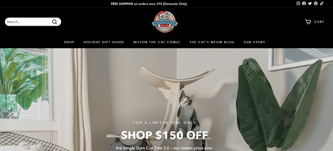 プリントオンデマンド商品と、猫のおもちゃやとまり木などのドロップシップ商品を組み合わせて販売しています. 彼らのウェブサイトのデザインは本当に完璧で、ブランディングは的を射ています。 また、彼らは独自のウェブサイト ブログも持っています。これは、店舗へのオーガニック トラフィックを促進し、売り上げを伸ばすのに役立つことは間違いありません。