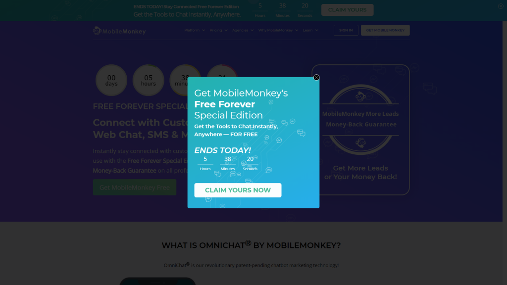OptiMonkはリード生成サービスであるため、独自のポップアップデザインを一流にする必要があるのは当然です。 この場合、明確なCTAを含むフルページのポップアップが表示されます。