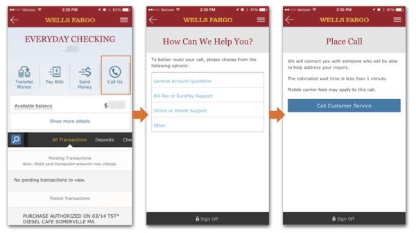 たとえば、ウェルズファーゴは「お電話」オプションを提供し、アプリ内から担当者と話すための推定待機時間を表示します。