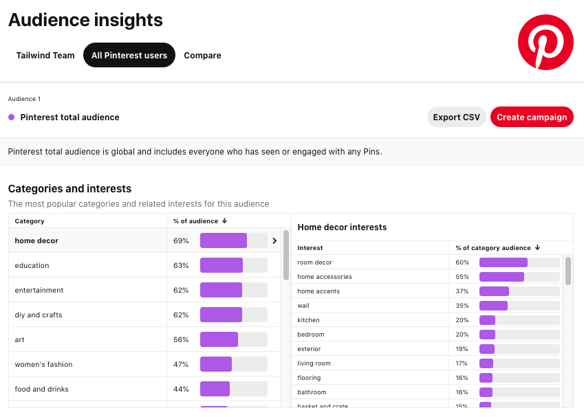 Pinterestに共有するものが、視聴者の興味を引くものであることを確認してください。 どのように? オーディエンスの洞察を確認してください(「分析」の下にあります)。 あなたはあなたの聴衆に最も魅力的な興味とカテゴリーを見ることができます。