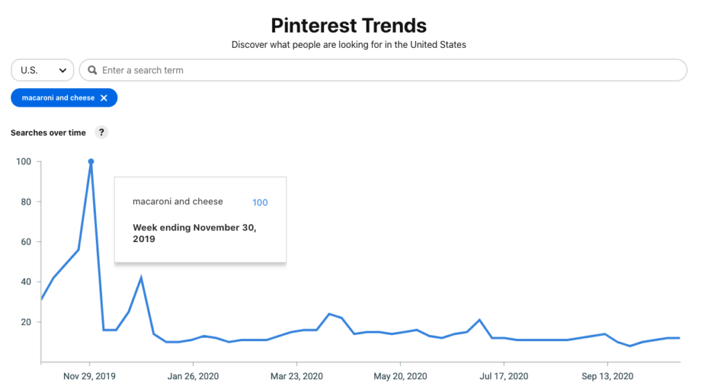 ヒント:居心地の良いコンフォートフードのマカロニアンドチーズのレシピ投稿がいつ最も適切になるかわかりませんか? 11月末。 どうすればわかりますか? Pinterestのトレンド!! コンテンツの計画に使用したことがない場合は、お願いします。試してみてください。
