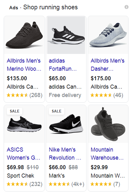 Googleショッピング広告は商品リスト広告とも呼ばれ、次のように表示されます。