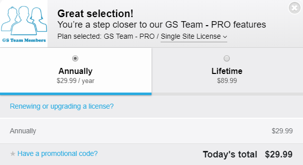 まず、[購入]ボタンをクリックして、ポップアップウィンドウから目的のライセンスを選択しない限り、製品のWebサイトに価格が表示されないようです。 これはベストプラクティスではありません。 説明させてください: ![[購入]ボタンをクリックしない限り、GSチームメンバープラグインのWebサイトに価格は表示されません。](/uploads/article/196980/tQnz5YeWsjsrJLzB.png)