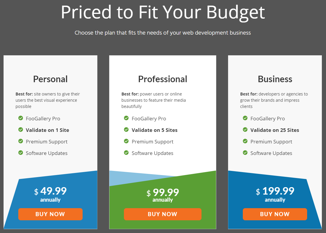 これの次のレベルは、Foo PluginsのメンバーがFooGalleryプラグインの価格表で行ったように、実際にさらに一歩進んで、各価格設定プランを自分の領域内にあることがわかっている特定のターゲットオーディエンスに合わせて調整することです。