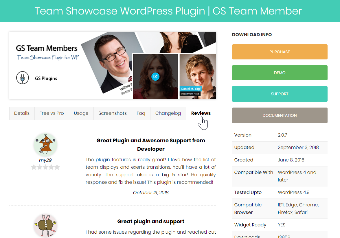 このプラグインは非常に視覚的であるため、デモページはプラグインの機能をよりよく理解するのに役立つ素晴らしいアイデアですが、プラグインがアクティブに実行され、実行されていることを確認できる、ライブクライアントWebサイトへのリンクの更新されたコレクションも表示したいと思います。もの。 必要に応じて、ある種のポートフォリオ。 これは、プラグインの信頼性を高めるのに役立つだけでなく、「GSチームメンバー」プラグインが役立つ可能性のあるシナリオに合わせてプラグインをカスタマイズする方法について考えられるアイデアを提供します。