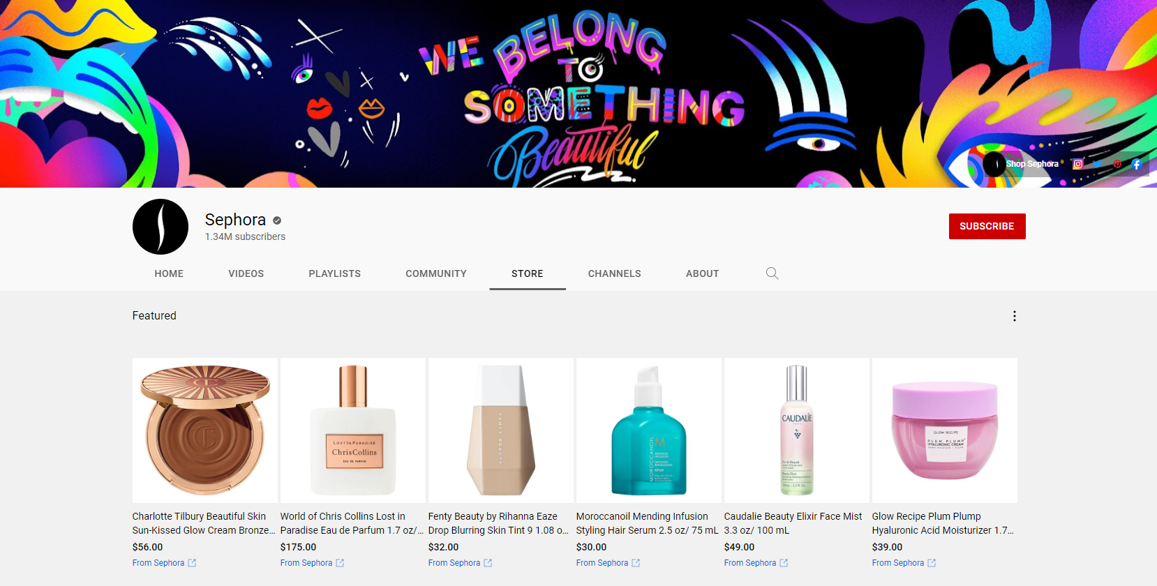現在、すべてのブランドが YouTube で利用できる一連のソーシャル コマース ツールを活用しているわけではありません。 Sephora のように、バーチャル ストアフロントをセットアップして、顧客が注目の製品を YouTube で直接閲覧できるようにしています。