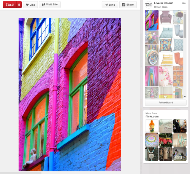 여기 Urban Barn은 "Live in Colour"라는 제목의 게시판에 매우 생생하고 다채로운 벽돌 벽의 사진을 게시했습니다. 이 전체 보드는 다채로운 장소, 자연, 음식 및 물론 그들이 가지고 다니는 가구의 사진으로 가득합니다. 이 사진은 해당 제품과 관련이 없지만 다른 Pinterest 사용자에게 시각적으로 매력적이므로 해당 페이지로 트래픽을 유도하는 데 효과적입니다.