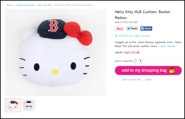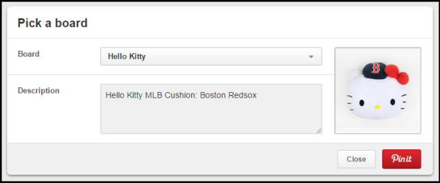 여기 Hello Kitty 공식 사이트에는 사용자가 이 봉제 베개를 "고정"할 수 있는 옵션이 있습니다. 사용자가 위의 상단 이미지에서 "Pin It" 버튼을 클릭하면 하단 이미지에 표시된 옵션이 있는 화면(별도의 창 또는 탭)으로 즉시 리디렉션됩니다. 그런 다음 사용자는 이미지를 게시하고 싶은 Pinterest 보드를 선택하고 설명을 추가할 수 있습니다. 이것의 좋은 점은 사용자가 웹페이지를 떠나지 않고 계속해서 제품을 탐색할 수 있다는 것입니다.