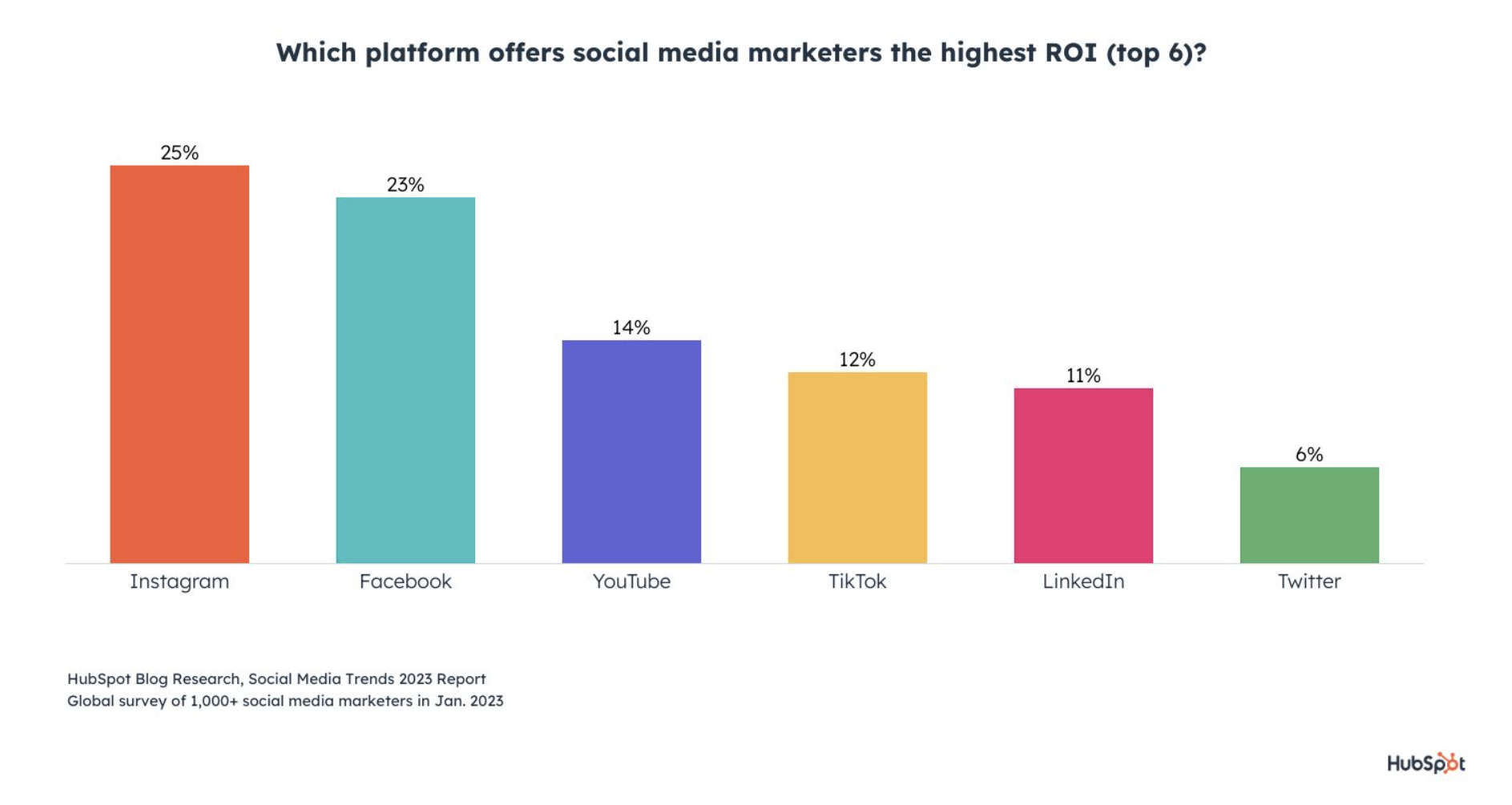 - 인스타그램은 소셜 미디어 광고 지출에 대해 25%로 가장 높은 ROI를 제공하는 반면, 트위터 광고는 6%로 가장 낮습니다. (허브스팟)