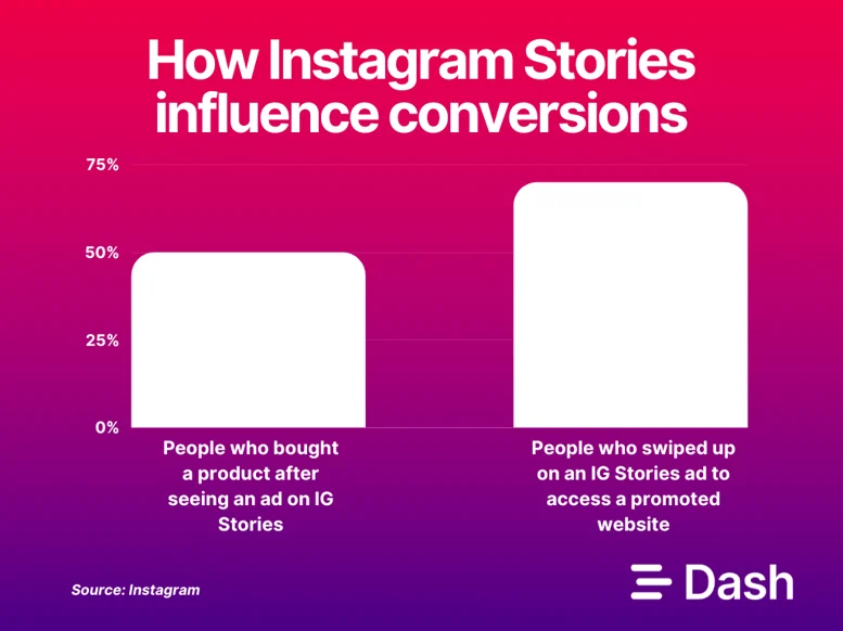 - 인스타그램 사용자(Z세대와 밀레니얼 세대 모두)의 50%는 인스타그램 스토리에서 광고를 본 후 구매를 위해 웹사이트를 방문했습니다. (대시)