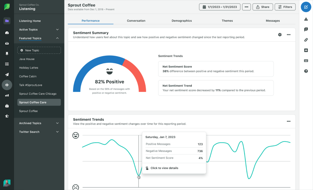 예를 들어 Sprout에서는 브랜드 언급의 비정상적인 급증을 감지하고 그것이 부정적인지 긍정적인지 모니터링할 수 있습니다. 이를 통해 평판을 적극적으로 모니터링하여 브랜드 상태를 확인할 수 있습니다. 마찬가지로, 감정 분석 알고리즘은 수신 메시지에 긍정적인 것과 부정적인 것으로 태그를 지정하므로 소셜 고객 관리 팀은 메시지의 중요성에 따라 메시지의 우선순위를 지정할 수 있습니다.