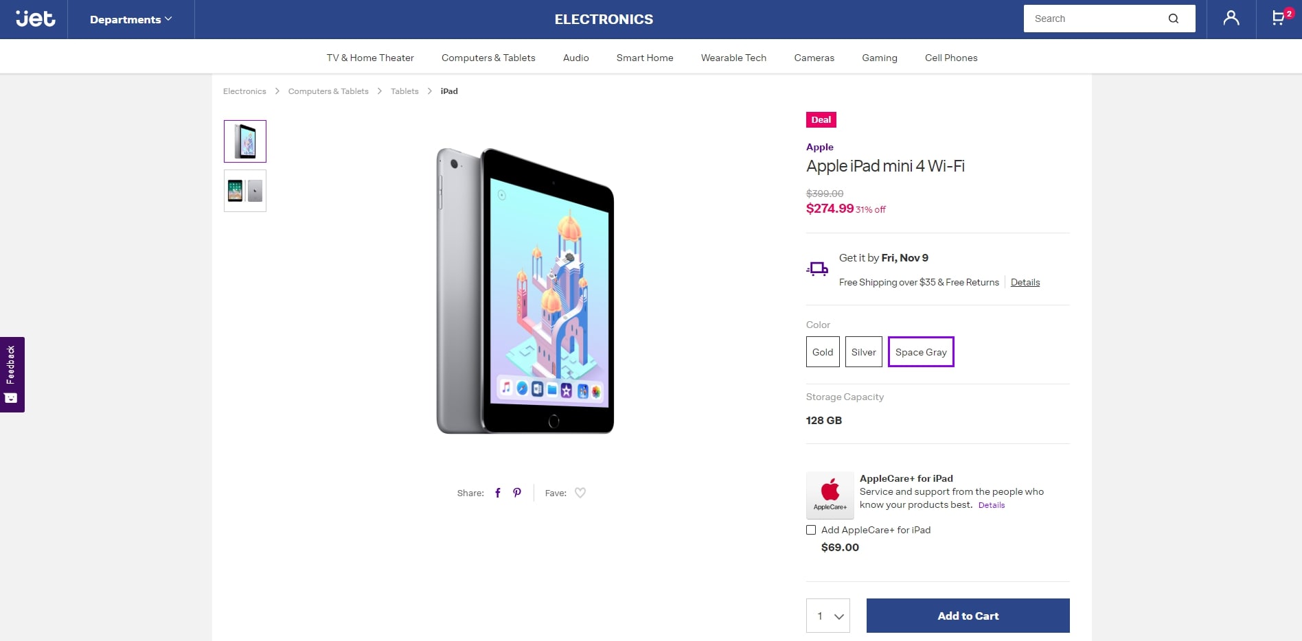 Jet.com은 밝은 분홍색 색조로 특별 판매 및 거래를 현명하게 강조합니다. "Deal"이라고 적힌 작은 아이콘과 극적이면서도 최소한의 할인율(동일한 색상으로 표시됨)은 방문자의 눈을 제품 가격으로 이끌고 절약된 비용을 강조합니다.