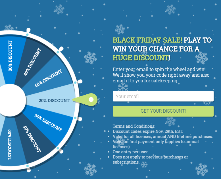 이제 게이미피케이션은 널리 사용되는 마케팅 기법이 되었고 제대로만 된다면 분명히 도움이 될 것입니다. FooGallery는 Black Friday 판매 페이지에 "Spin Wheel" 종류의 게임을 구현하여 Black Friday 특별 프로모션을 진행했습니다.