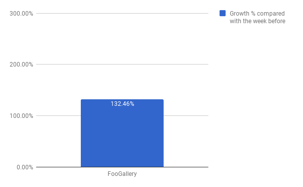 차트에서 볼 수 있듯이 BFCM 주간의 FooGallery 성장률과 그 전 주간의 수익만 비교할 수 있었습니다. FooGallery가 11월 동안 EDD를 통한 추가 기능 판매에서 Freemius를 통한 Pro 플랜 판매로만 마이그레이션했기 때문에 9월의 수익 통계는 불행히도 사용할 수 없습니다. 그럼에도 불구하고 이 이미지 슬라이더 플러그인에 대한 블랙 프라이데이 및 사이버 먼데이(132% 성장은 매출이 두 배 이상 증가했음을 의미) 동안 심각하게 인상적인 매출 성장을 보였습니다.