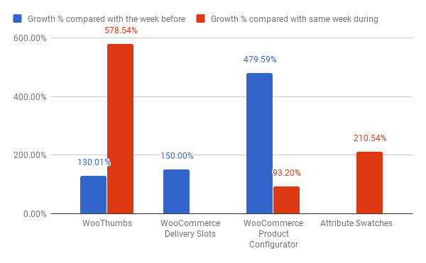 BFCM 주간의 IconicWP 제품 매출과 매출을 두 기간과 비교할 때 추세가 일관성이없고 약간 혼란 스럽지만 그럼에도 불구하고 블랙 프라이데이와 사이버 먼데이 주간에는 모든 제품이 어떻게 보더라도 급격한 매출 성장을 보입니다. . 또한, 그들의 제품 중 하나인 '속성 견본'은 블랙 프라이데이/사이버 먼데이 전 주에 매출 증가가 전혀 없었습니다.