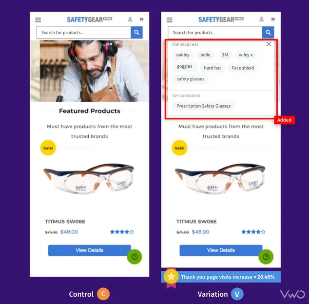 Safety Gear Pro는 꽤 오랫동안 VWO와 협력해 왔으며 여러 테스트를 실행했으며 그 중 하나는 VWO 웹사이트의 검색 상자 디자인을 개선하는 것이었습니다. 검색창의 크기를 키운 변형이 승자로 나왔지만 팀은 거기에 그치지 않고 반복을 거듭했다.