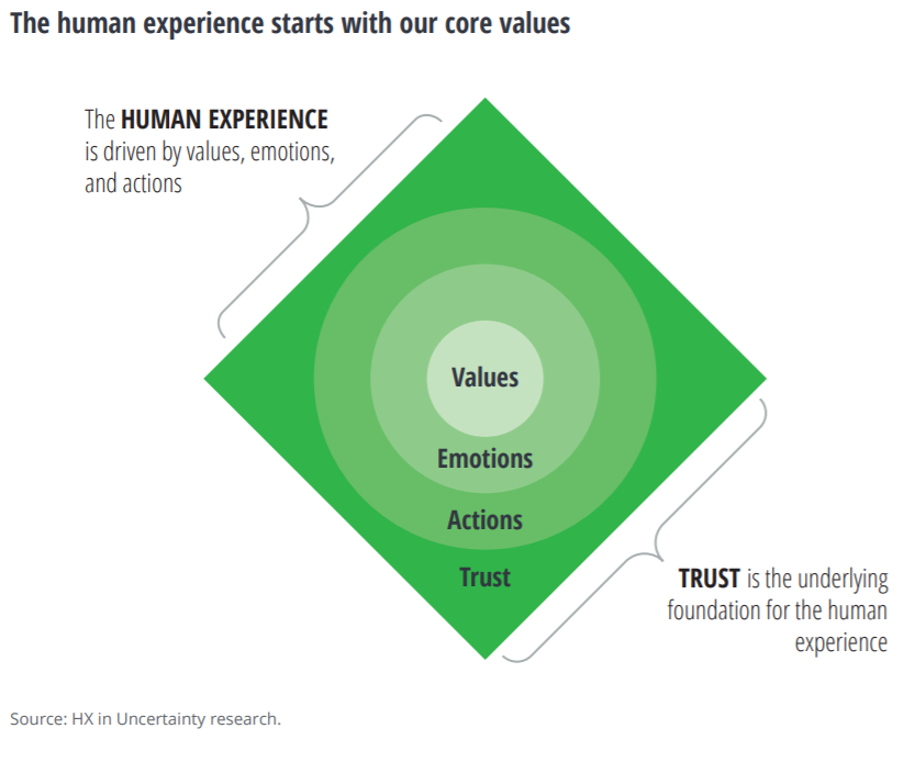 - 가치 재고 . 인간의 경험은 가치에 의해 인도되며 가치는 우리가 가지고 있는 감정과 우리가 취하는 행동을 결정합니다. 구매 선택의 95%는 무엇보다도 감정을 포함하여 무의식적인 필요에 기반합니다. 이것이 기업이 기반을 두고 청중과 공유 하는 가치와 사명 을 재고하기 시작해야 하는 이유입니다. 이것은 기업과 사용자 간의 관계를 특징짓고 인간 경험의 기초를 형성하는 신뢰 를 높일 것입니다.