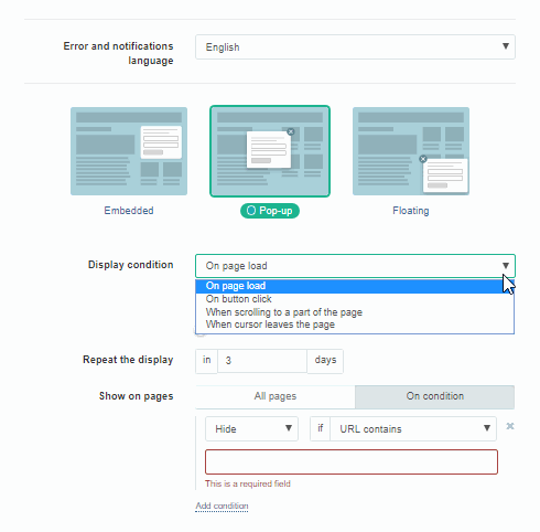 - 표시 조건 선택: 클릭, 페이지의 특정 부분으로 스크롤할 때 또는 페이지를 떠날 때.