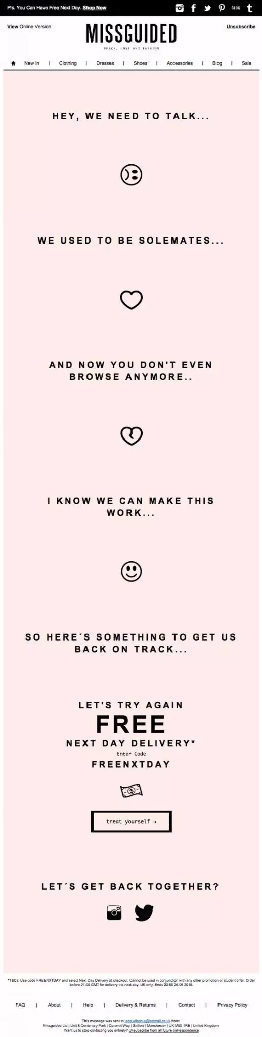 아래 예에서 Missguided는 무료 배송을 제공하여 가입자가 구매하도록 유도합니다.