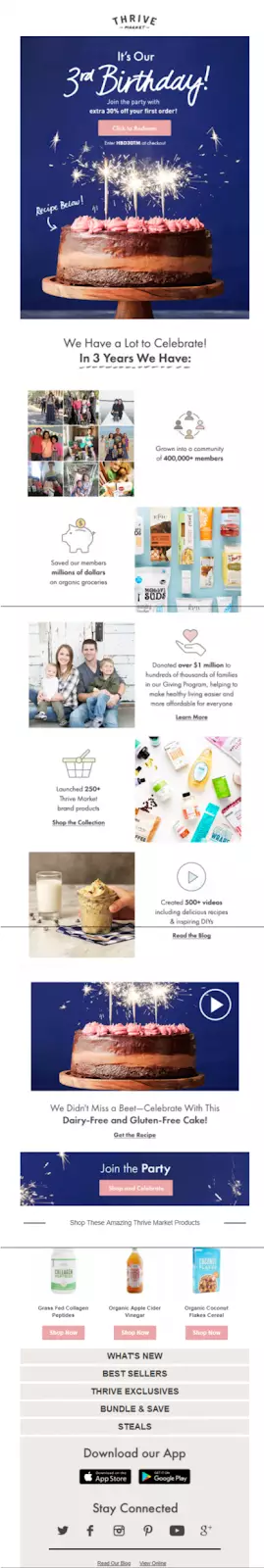 이메일에 대한 고객의 상호 작용 또는 웹사이트에서의 행동 외에도 자동화된 이메일은 특정 데이터에 의해 트리거될 수도 있습니다. 예를 들어, Thrive Market은 회사 창립일에 특별 행사 이메일을 보냅니다. 이메일은 3년 동안 회사의 진행 상황을 설명하고 날짜를 축하하기 위해 초대합니다. 또한 가입자는 첫 주문에서 30% 할인을 받을 수 있습니다.