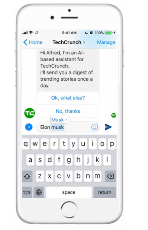 - 현재의 관심과 필요 : Whole Foods Market, Food Network, TechCrunch와 같은 회사는 이미 연락처가 관심 있는 콘텐츠를 찾도록 도와주는 챗봇을 보유하고 있습니다. Google에 쿼리하는 방식과 마찬가지로 봇 검색도 점점 더 많이 수행될 것입니다. 아래 예에서 사용자는 최신 Elon Musk 뉴스에 대해 TechCrunch 봇에 쿼리합니다.