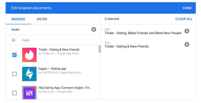 "게재위치" 페이지에서 다른 데이트 앱에도 광고를 표시하도록 선택할 수 있습니다.