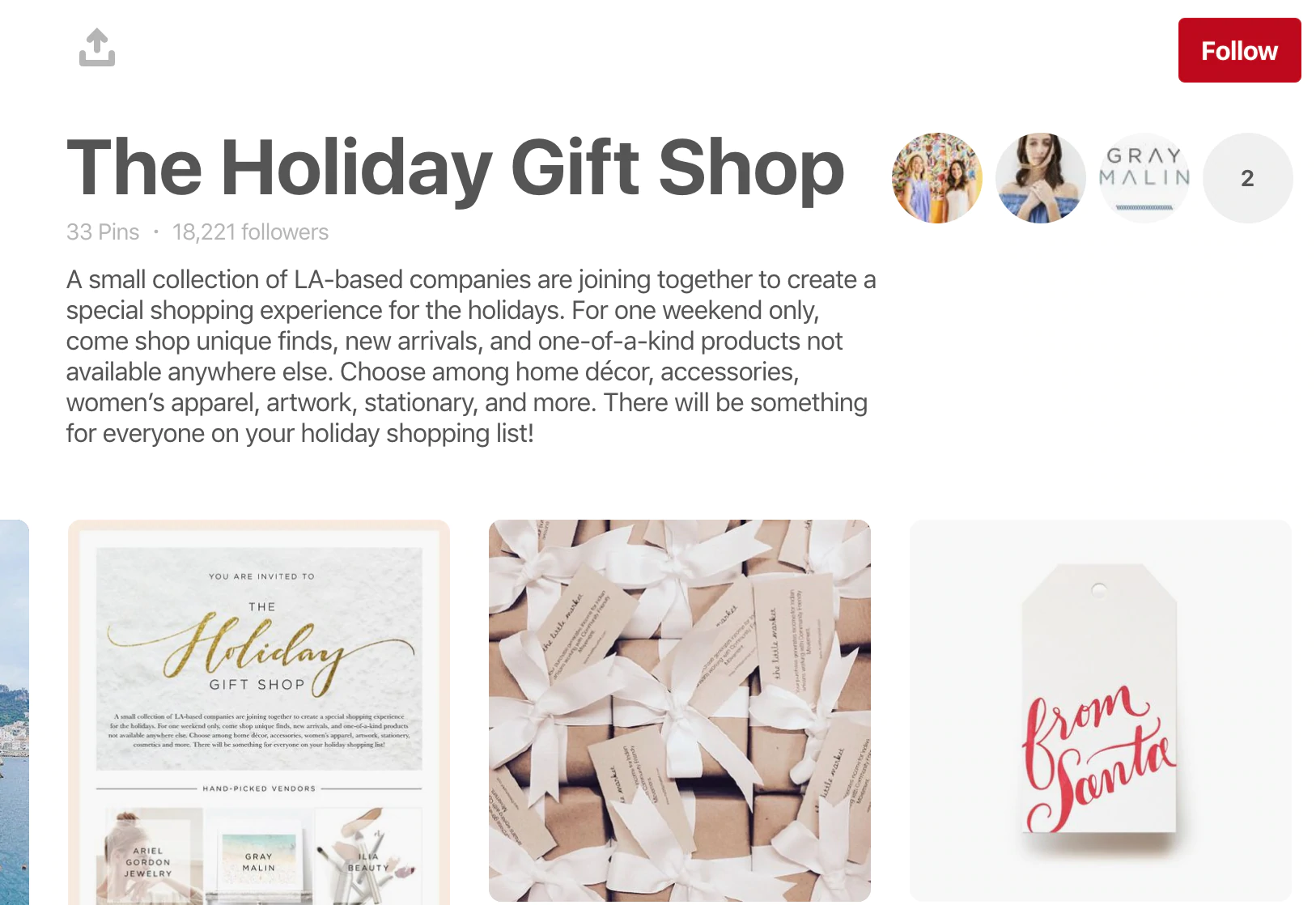 그렇기 때문에 이 전략은 잠재고객과 미학이 유사한 브랜드와 팀을 이룰 때 가장 적합할 수 있습니다. 예를 들어 The Little Market은 다른 LA 기반 브랜드와 협력하여 크리스마스 선물을 선별하는 그룹 게시판을 만들었으며 그 결과 모든 제품을 포함하는 일관되고 브랜드 내 협업이 이루어졌습니다.