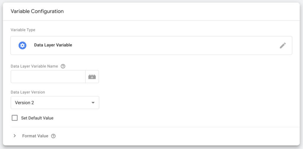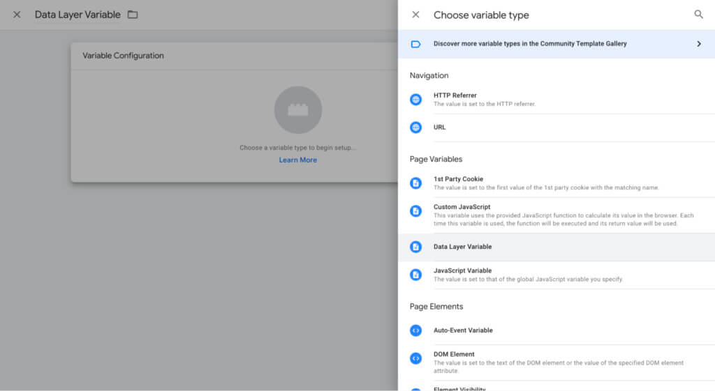 그런 다음 Google 태그 관리자의 변수 탭으로 이동하여 새로 만들기를 클릭한 다음 데이터 영역 변수를 선택합니다.