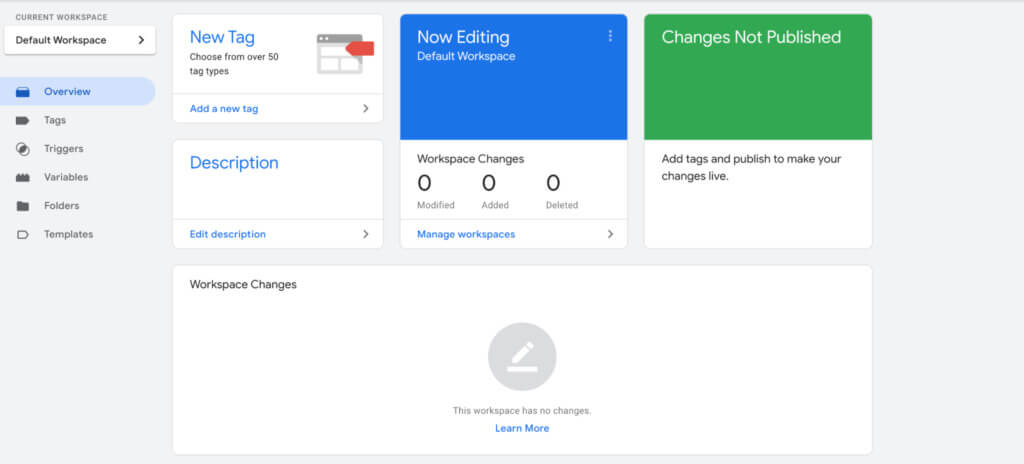 GTM 대시보드의 사이드바에 표시되는 기본 세 가지 레이블은 태그, 트리거 및 변수입니다.