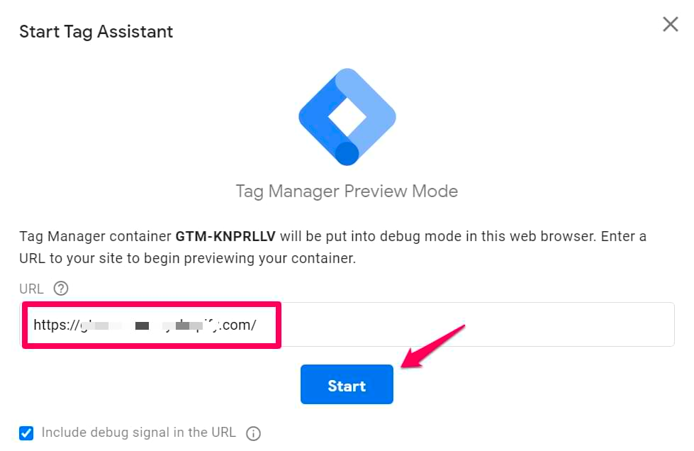 또한 GTM 대시보드의 오른쪽 상단에 있는 미리보기 버튼을 클릭하고 웹사이트 URL을 입력하여 올바른 컨테이너가 웹사이트에 연결되었는지 확인할 수 있습니다.