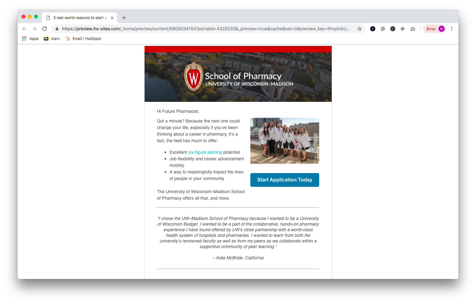 첫째, 예비 지원자는 얼리 디시전 및 비 얼리 디시전 지원자 모두에게 지원 방법, 지원해야 하는 이유 및 위스콘신 대학교 매디슨 스쿨 을 선택해야 하는 이유에 대한 중요한 정보를 제공하는 다중 이메일 드립 워크플로를 통해 지원하도록 권장되었습니다. 약국의. 이 캠페인의 구현으로 School of Pharmacy는 많은 수의 예비 지원자와 대화를 시작할 수 있었고 지원자의 수와 지원자의 질을 모두 높일 수 있었습니다.