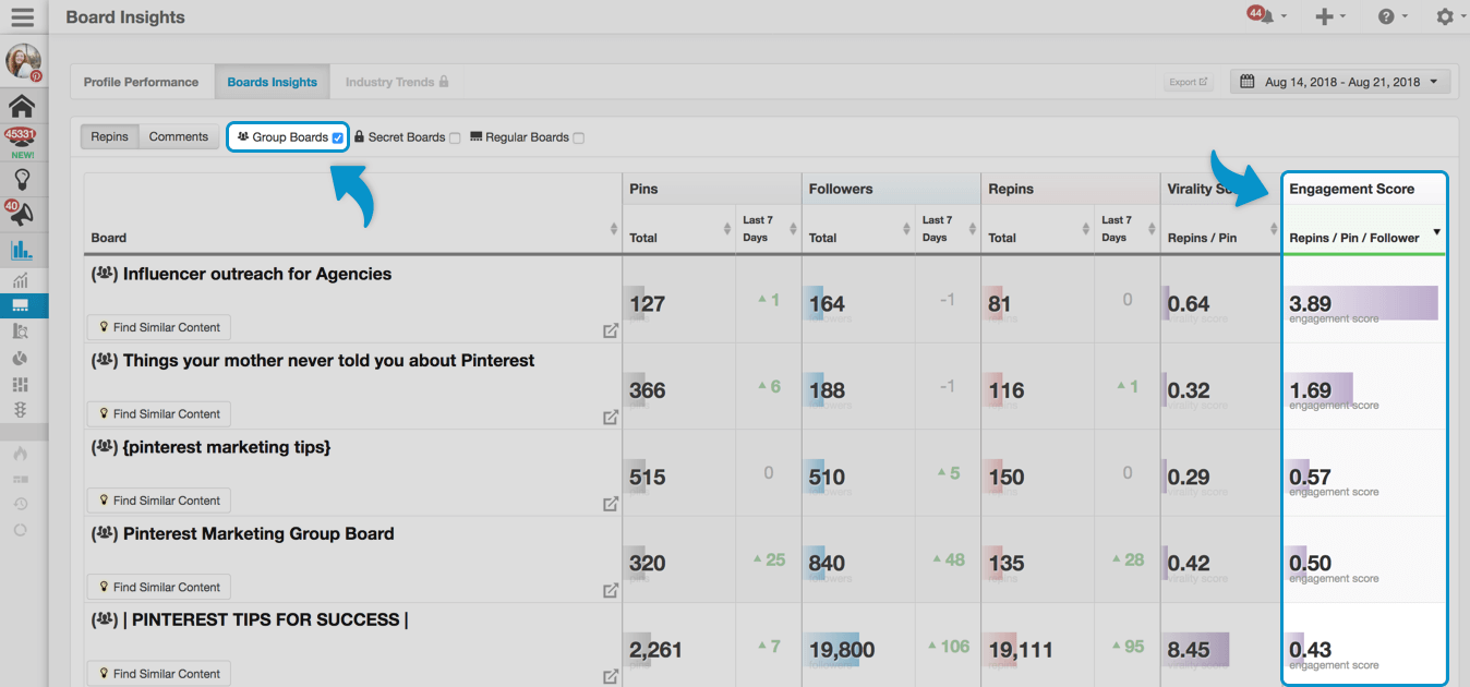 도구 팁: Tailwind의 Board Insights 및 Pin Inspector를 사용하여 그룹 보드의 성능을 평가하십시오. 그들이 당신을 위해 수행하지 않는다면, 당신의 시간을 다른 곳에 집중하십시오. 보편적으로 인정되는 "좋은" 참여도나 바이럴리티 점수는 없습니다. 나는 내 계정 전체의 평균을 보고 그 수치 아래로 떨어지는 계정을 종료하는 경향이 있습니다.