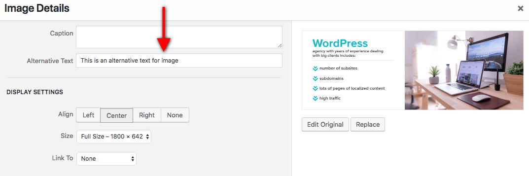 워드프레스에는 대체 텍스트를 추가할 수 있는 별도의 상자가 있습니다. "미디어 추가"를 클릭하거나 이미지 대체 태그에 이미지를 "편집"합니다. 대체 텍스트를 추가하는 방법과 이미지 로드에 실패할 때 표시되는 방법에 대한 아래 스크린샷을 참조하세요.