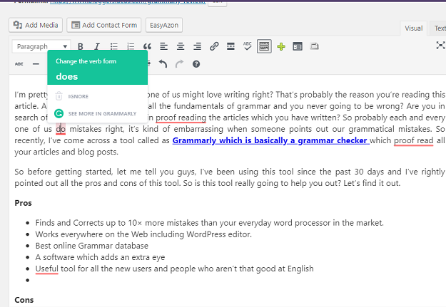 예를 들어 WordPress 편집기의 스크린샷을 추가했으며 빨간색으로 표시된 모든 문법 오류를 쉽게 찾고 수정할 수 있습니다.