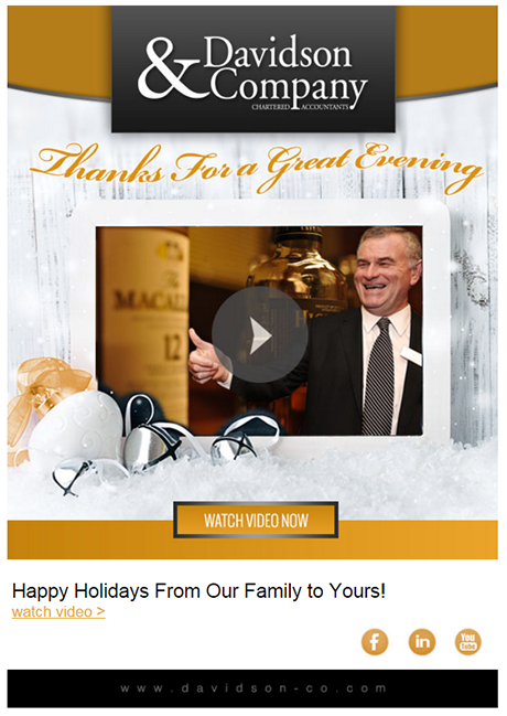 연중 어느 때라도 고객은 항상 인정받고 싶어합니다. 감사의 마음을 표현하기 위해 이메일을 사용할 수 있는 방법에는 여러 가지가 있습니다. 예를 들어 Davidson & Company, LLP와 같은 비즈니스는 연말연시 비디오가 포함된 이메일을 보내 멋진 한 해에 감사를 표합니다.