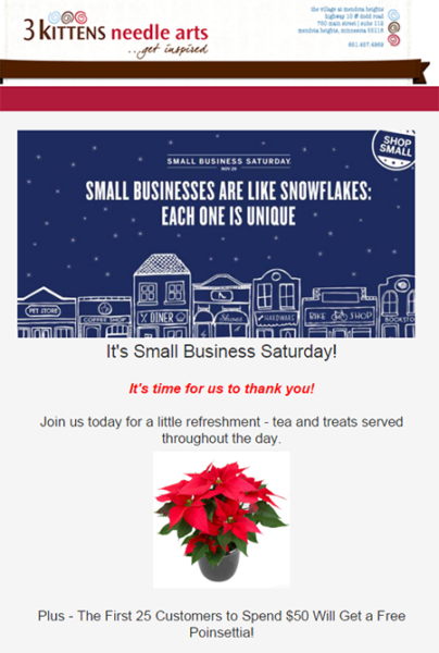 예를 들어, 1년 동안 미네소타 원사 상점인 3 Kittens Needle Arts는 Small Business Saturday에 $50 이상을 지출하는 첫 번째 25명의 고객에게 무료 포인세티아를 증정하여 휴일을 축하했습니다.
