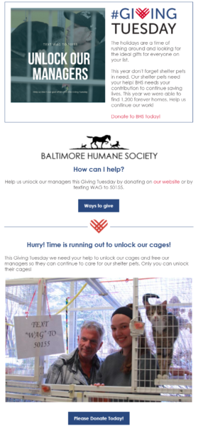 이번 휴가 시즌에 새로운 방식으로 서포터들을 참여시키기에 너무 늦지 않았습니다. 볼티모어 휴메인 소사이어티(Baltimore Humane Society)는 기부자들에게 "관리자 잠금 해제"를 위해 기부한 후 50155에 "WAG"라는 문자를 보내달라고 요청하는 홀리데이 콘테스트를 운영했습니다.