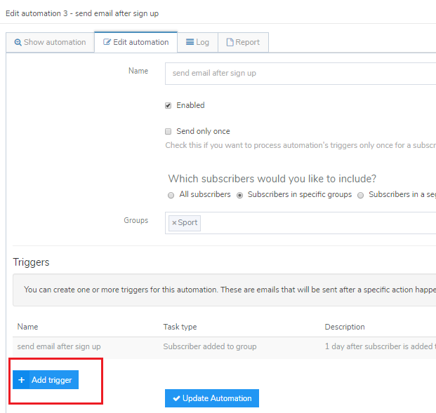 자동화를 다시 클릭하고 사용하려는 것을 선택하고 편집할 수 있습니다. 다음 단계는 이 자동 응답기에 다른 트리거를 추가하는 것입니다.