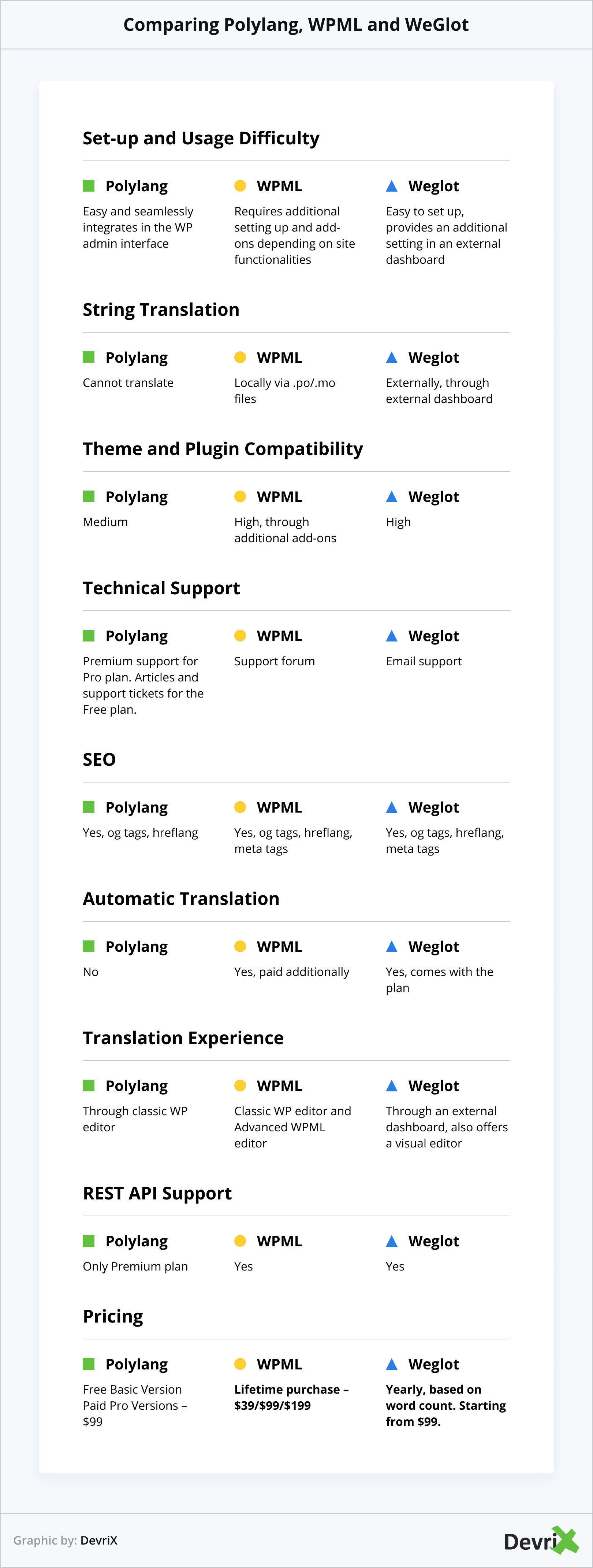 여기 DevriX에서 우리는 Polylang과 WPML에 대한 좋은 경험을 가지고 있습니다. 국제 전자 상거래 다국어 다중 사이트에서 작업한 후 대규모 웹 사이트 및 온라인 소매업체를 위한 최상의 솔루션 중 하나이므로 사용을 강력히 제안할 수 있습니다.