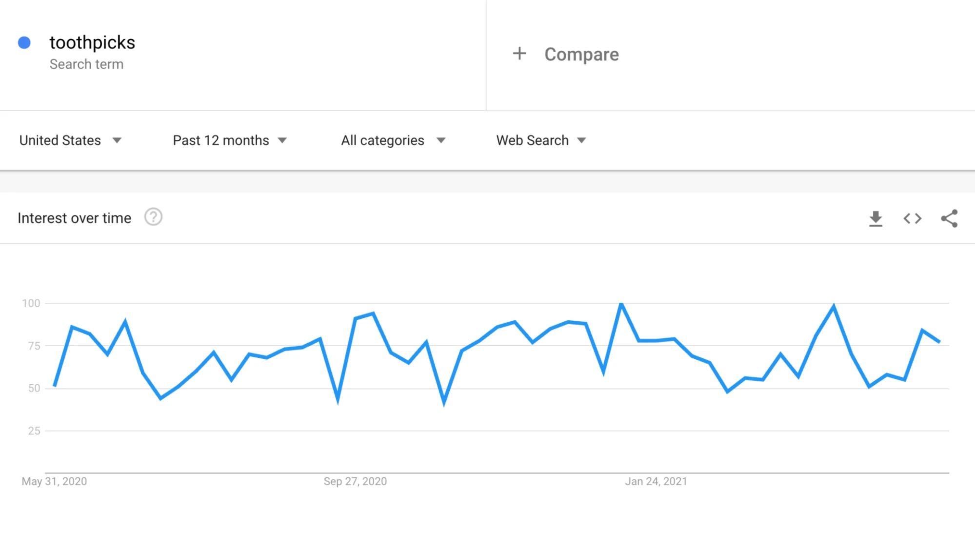 Google 트렌드는 어떤 것이 유행인지, 트렌드인지, 성장하는 시장인지, 아니면 안정적인 시장인지에 대한 큰 그림을 제공하는 데 도움이 될 것입니다. 설명할 수 없는 스파이크가 표시되면 추가 검색을 수행하여 가능한 원인이 무엇인지 확인합니다.